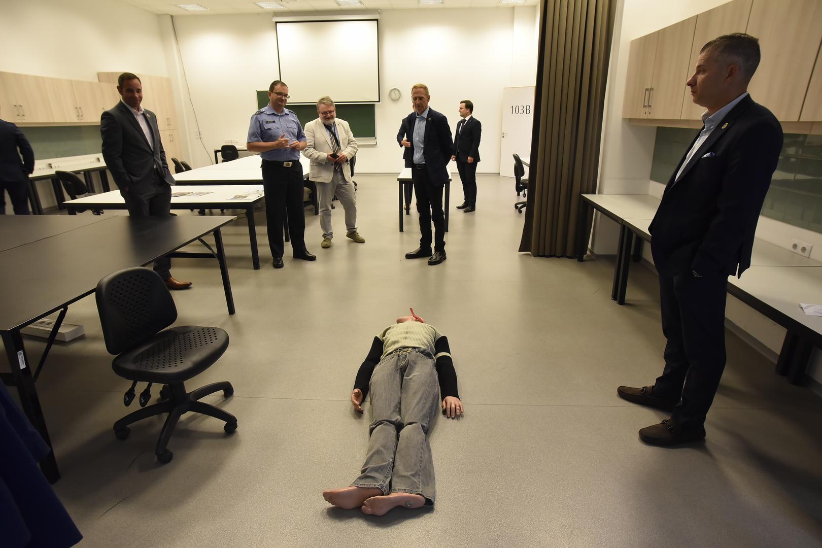 The program included visits to several training facilities, enhancing experiential learning and skill transfer. Delegation members had the chance to observe the university’s outstanding training environments firsthand. Their tour began at the tactical house, a modern facility designed for practicing high-risk police interventions and team operations. They gained insight into the educational functions of various forensic laboratories, including the polygraph and interrogation room.