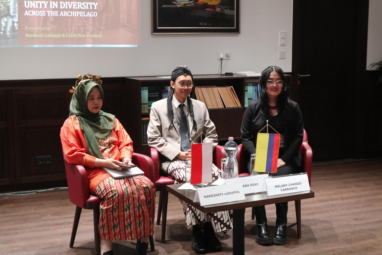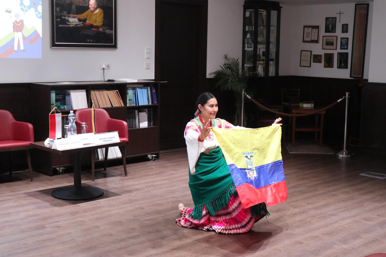 Melany Jhadira Chango Carrasco, a first-year student in the International Water Policy and Water Diplomacy master’s program, spoke about Ecuador. She noted that the country is located in the second-highest region in the world. Attendees also learned about a myth regarding Ecuador’s formation: according to the story, the mountains—considered natural treasures—originated from a love story and help with geographic orientation in the country. Participants were introduced to numerous indigenous animal and plant species and learned that Ecuador is the country of orchids, as well as home to several volcanic lakes, mountains, and waterfalls. Famous Ecuadorian athletes and musicians were mentioned, along with the fact that insects in the Amazon are significantly larger than those in Europe, and insect-eating is becoming trendy. On the highlands, cuy (roasted guinea pig) is a popular dish, alongside plantains. Regarding the local language, Kichwa, it was explained that compliments are used in place of greetings. The presentation concluded with a dance performance in traditional national costume.