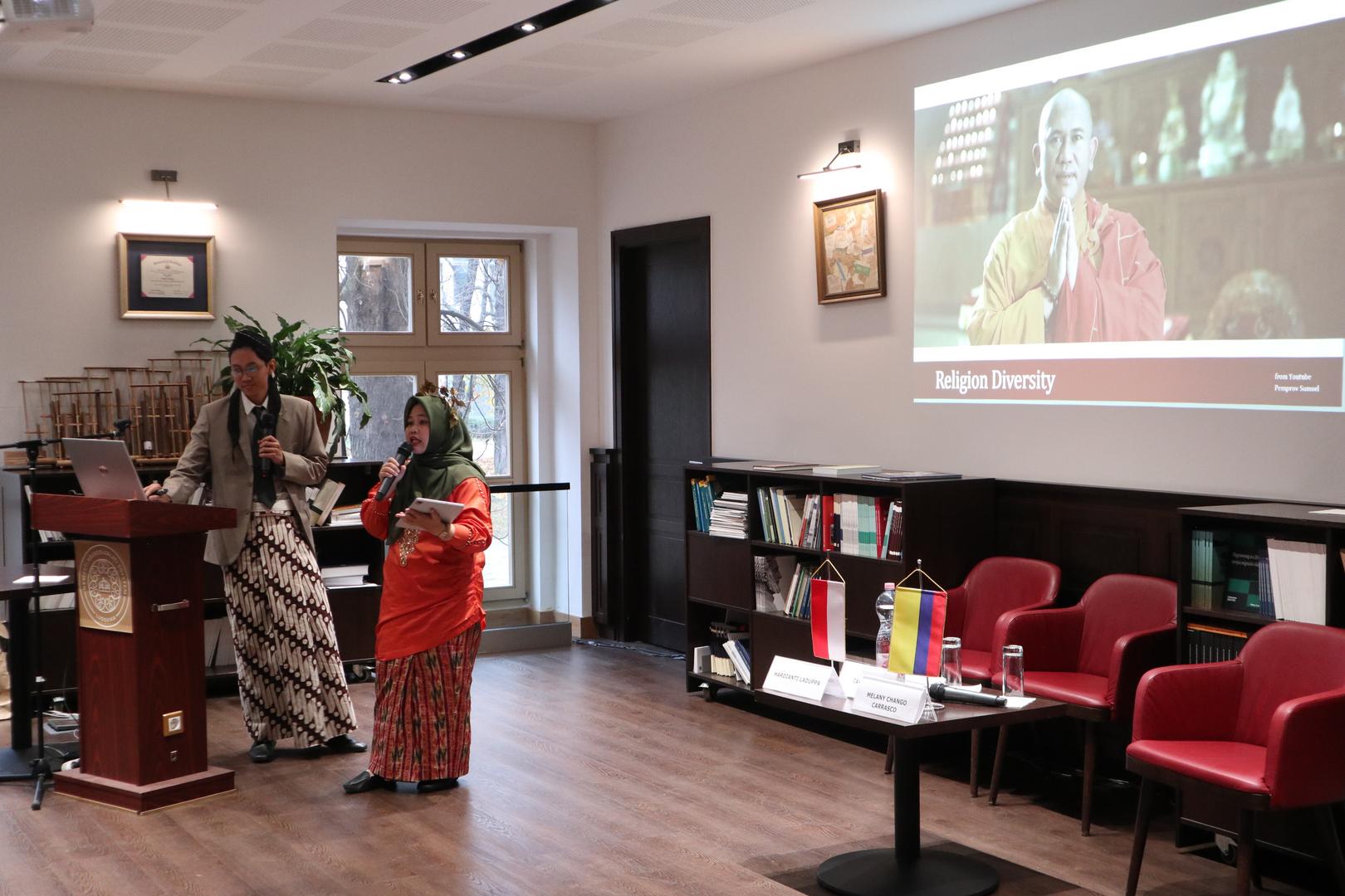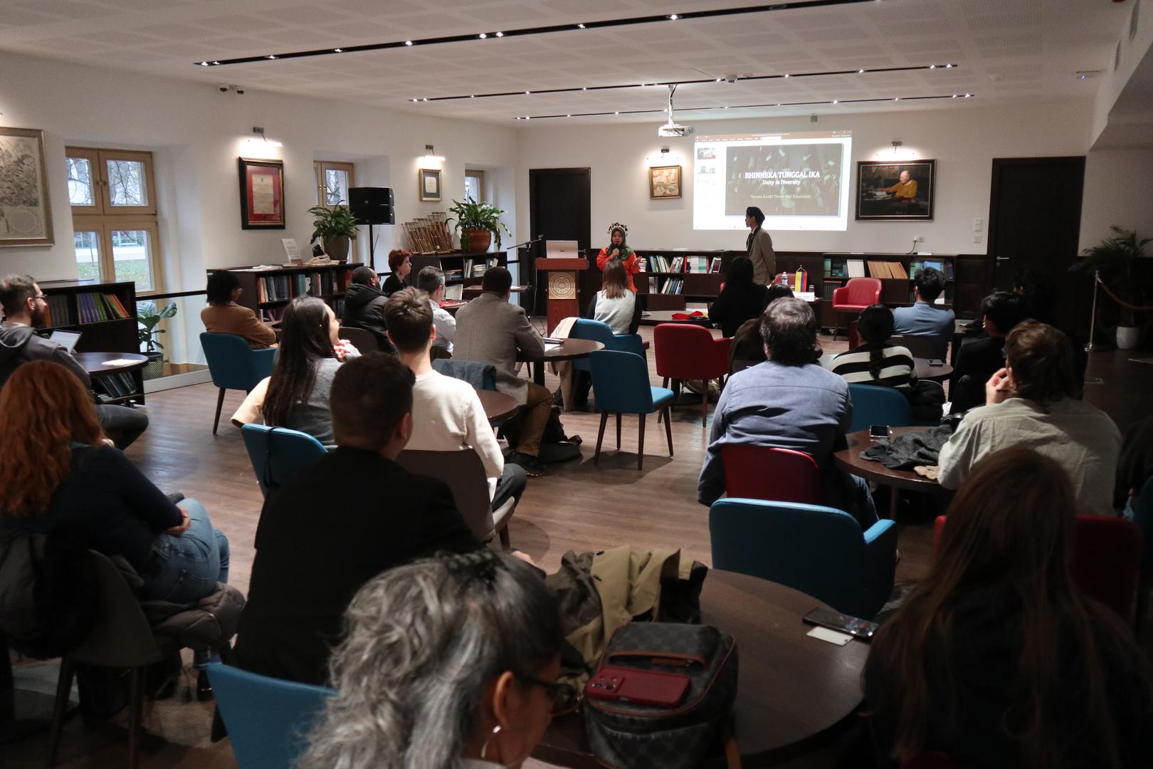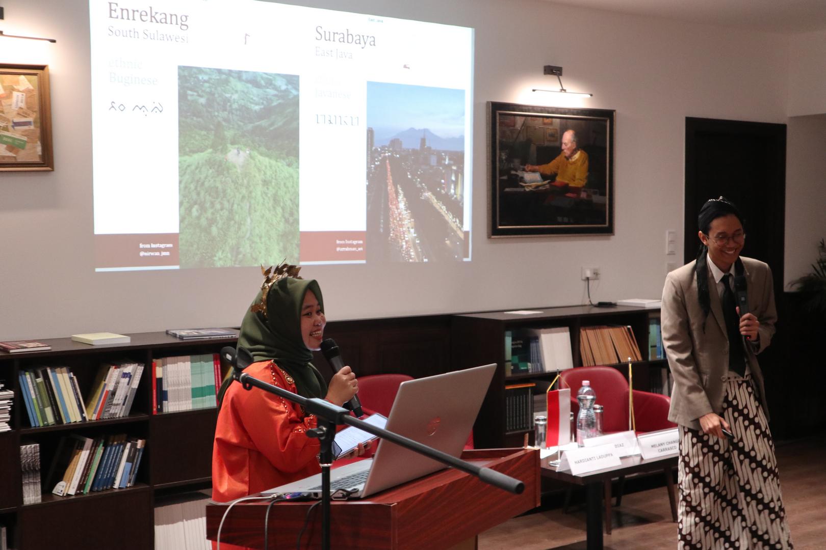 Hardianti Laduppa, a first-year student in the LUPS Doctoral School of Public Administration, and Pratama Cakra Diaz, a second-year student in the International Relations master’s program, introduced Indonesia. The presenters, dressed in traditional national attire, alternated to showcase their local cultures and social customs. Despite having hundreds of ethnic groups, six official languages, and regional autonomy, Indonesia has been a unified country since 1928, with local communities still supporting each other today. The students highlighted two Indonesian cultural traits: sungkan and legawara. The first means showing maximum respect by not embarrassing others or holding them accountable. The second can be described as a lack of ability to say no—Indonesians often respond positively even during difficult times. The presentation ended with a musical performance, featuring a rendition of the well-known folk song “Tavaszi szél” on the angklung, which the audience could try out themselves.