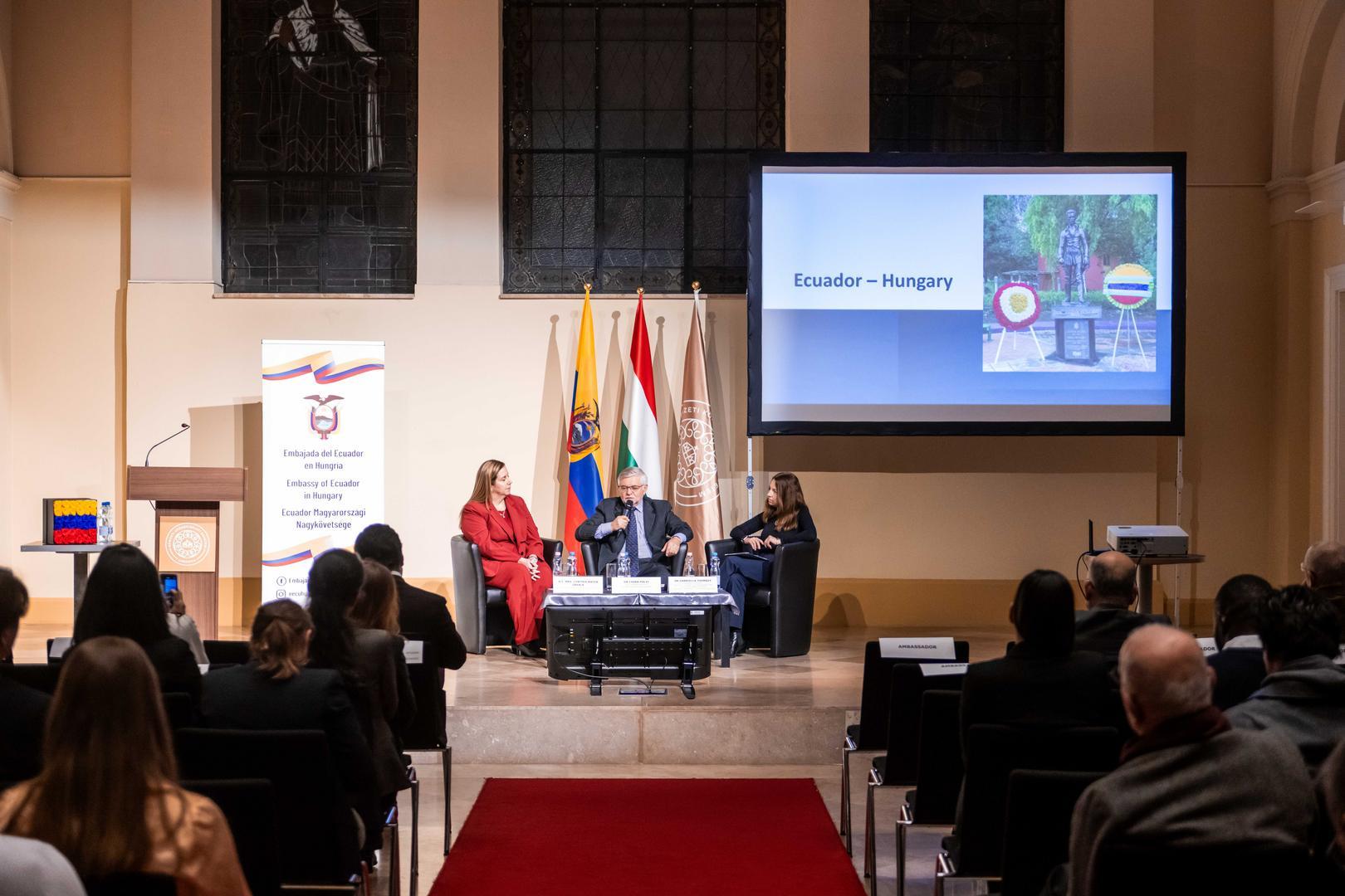 The lecture was followed by a roundtable discussion, in which, alongside the Ambassador, Gabriella Thomázy, Assistant Professor at the Department of International Relations and Diplomacy of the Faculty of Public Governance and International Studies (FPGIS) at LUPS, also took part, moderated by former Ambassador and Latin America expert Csaba Pólyi. The participants discussed issues related to bilateral foreign policy, economic relations, tourism, and cultural cooperation. A highlighted topic was the transformation and distribution of work, as well as its social impact, and the challenges inherent in international trade. Education and the situation of students were also discussed, with particular emphasis on the importance of teacher support. During the discussion, participants also addressed the role of Hungarian communities and diplomatic representations, with special attention to cultural diplomacy. It was noted that the Hungarian Embassy in Quito organizes an exceptionally active cultural and community life: programs include, among others, film screenings, concerts, exhibitions (such as events dedicated to Olga Fisch, the Hungarian painter and textile artist and researcher of Ecuadorian folk art), as well as events related to Hungarian national holidays, which attract an increasingly broad audience year after year. The speakers agreed that a presence built on personal encounters and shared cultural experiences strengthens the partnership between Ecuador and Hungary in the long term.