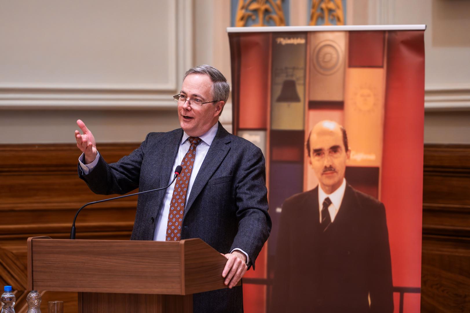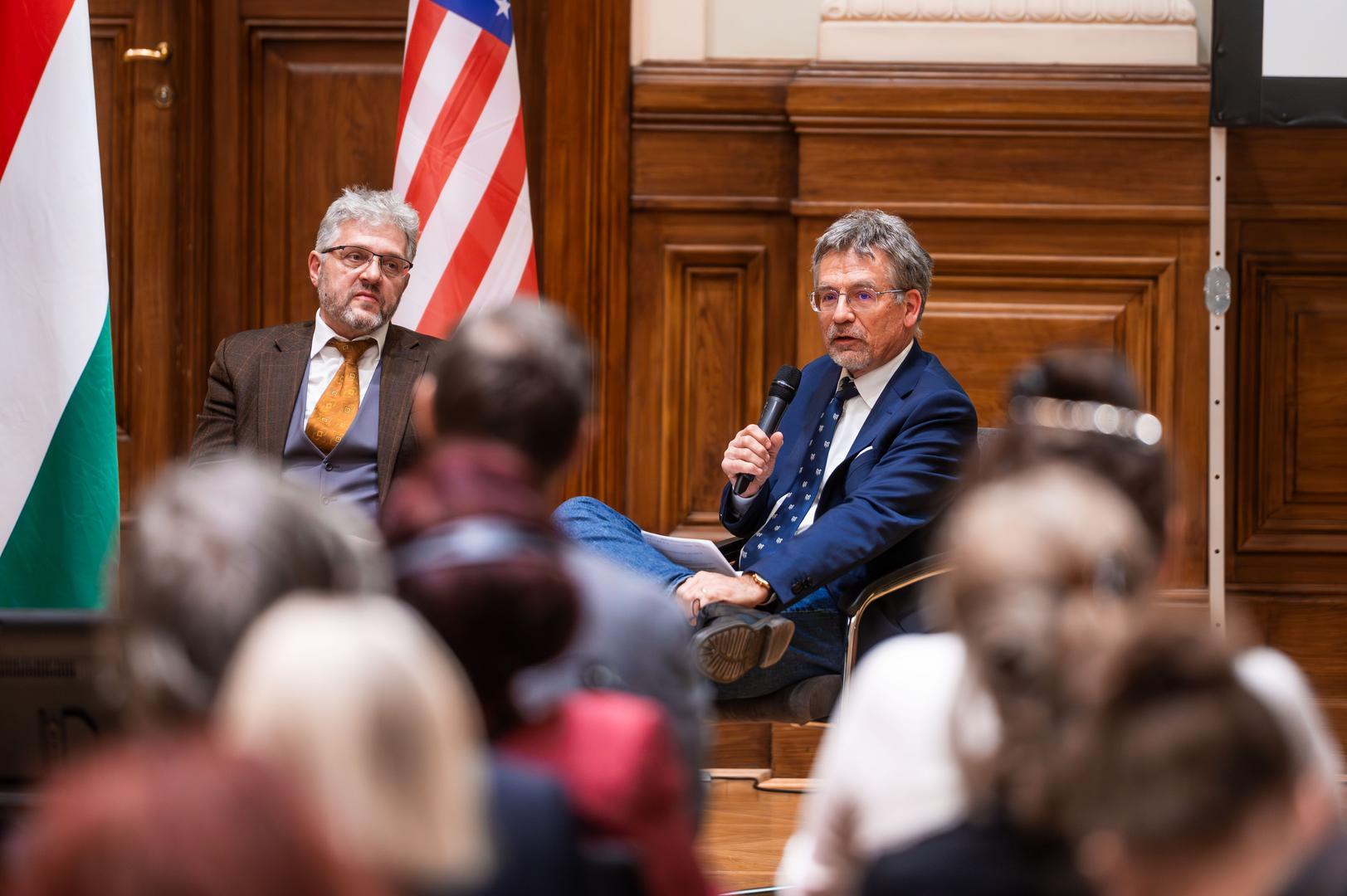 Gergely Prőhle, Program Director of the John Lukacs Institute and Director of the Otto von Habsburg Foundation, also welcomed the audience. He recalled that in 2013 he spent several days in Washington in the company of John Lukacs and his wife and highlighted the historian’s direct and approachable nature. He also spoke about the special moment when, in 2021, crates that had long been sealed in the university’s basement were finally opened, revealing John Lukacs’s personal belongings: the wine glass, the cigar box, and the small keepsakes all contributed to bringing visitors closer to the historian’s personality. These objects are not only mementos but also represent a task: the interpretation and transmission of the legacy. The director emphasized that, as the first pillar of the program series connected to the 250th anniversary, John Lukacs’s life’s work fittingly opens the dialogue examining the American contributions of thinkers of Hungarian origin.