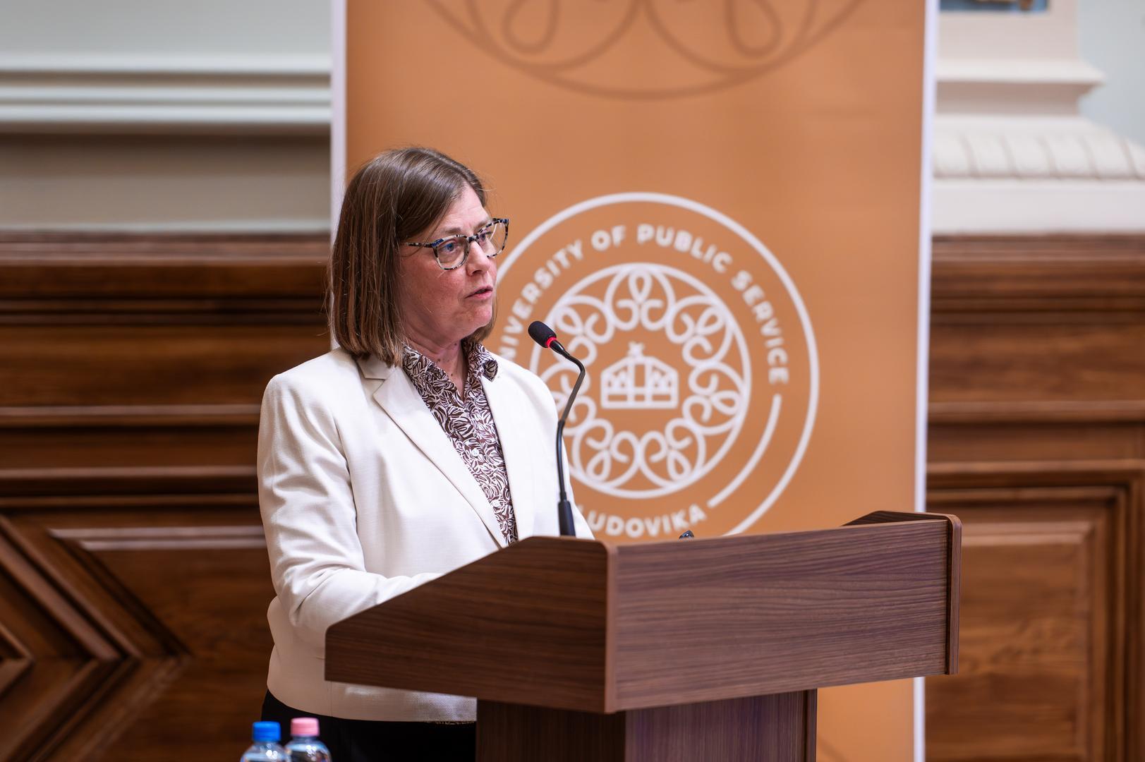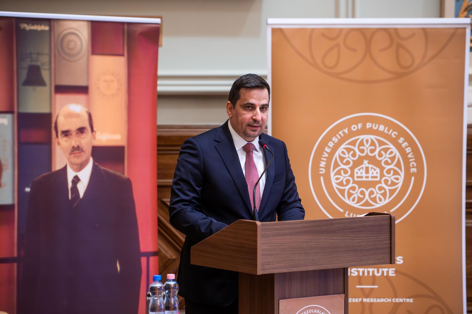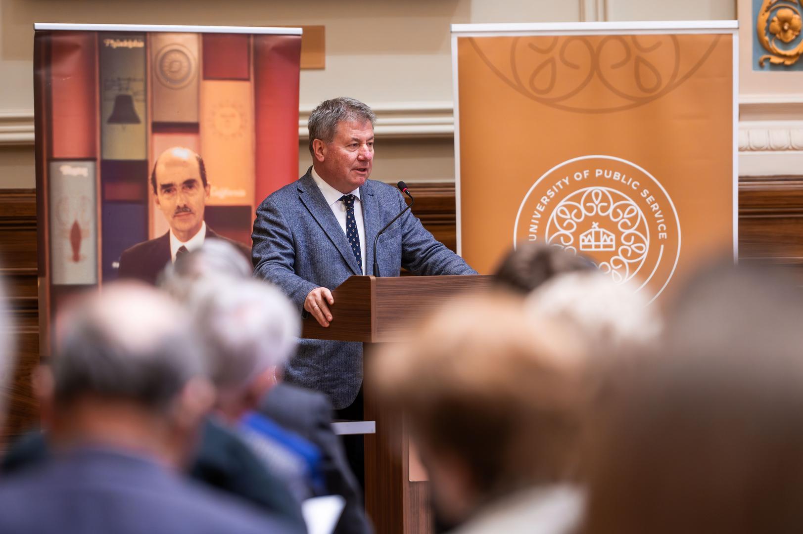 In his welcoming remarks, Gergely Deli, Rector of Ludovika University of Public Service, emphasized that the present conference created yet another opportunity to jointly review the intellectual legacy of the world-renowned historian, as well as the significance of his Hungarian and American identity. He stressed that Lukacs’s work and way of thinking are of particular importance for LUPS, which consciously cultivates John Lukacs’s intellectual heritage. Among other initiatives, in December 2021 the John Lukacs Lounge was opened in the university’s Side Building, where some of the historian’s personal belongings, books, and manuscripts are on display. This was followed in 2022 by a conference titled John Lukacs and American Conservatism, and in January 2024 his centenary was commemorated at a conference entitled Spirit and Character. In parallel, the John Lukacs Institute was established at the university, one of whose primary goals is the preservation and transmission of Lukacs’s intellectual legacy. Gergely Deli recalled that John Lukacs left Hungary with his family in 1944 at a young age, yet throughout his life he remained Hungarian in his identity. This is also expressed by the idea that became the motto of this year’s event. He emphasized that Lukacs’s approach to historiography introduced new emphases into 20th-century historiography: he placed the role of the individual, personality, and mentality at the center of historical analysis, creating a bridge between European and American modes of thought, and his historical writing remains a source of guidance today.