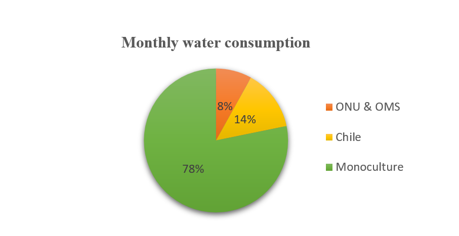 The pie chart illustrates the significant disparity between the monthly water consumption of avocado monoculture and that of the population in the Municipality of Cabildo, where agricultural demand far exceeds domestic use. In addition to water scarcity, the area faces aquifer contamination from fertilisers, air pollution from pesticides, and soil erosion. The valley’s enclosed geography intensifies heat and traps particles, creating a local greenhouse effect. Agricultural expansion has replaced native vegetation, disrupting biodiversity and ecological cycles, thereby contravening SDG 6 of the United Nations 2030 Agenda, which advocates for equitable access to clean water and its sustainable management