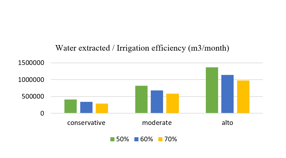 Representation of three cases: Considering a density of 800 trees per hectare, a 30-day month, and a total of 228,571 trees, it is possible to estimate the evapotranspiration-based consumption.