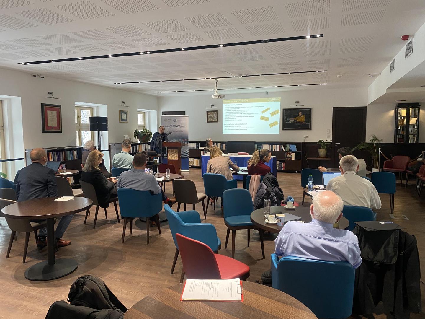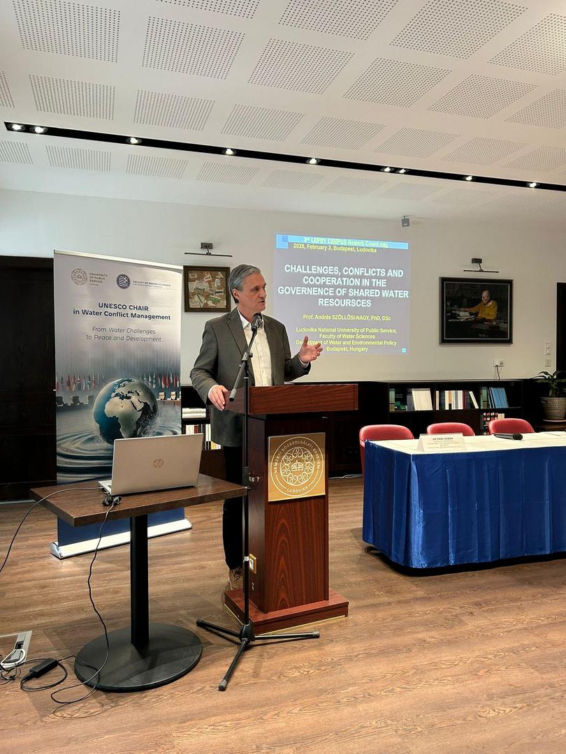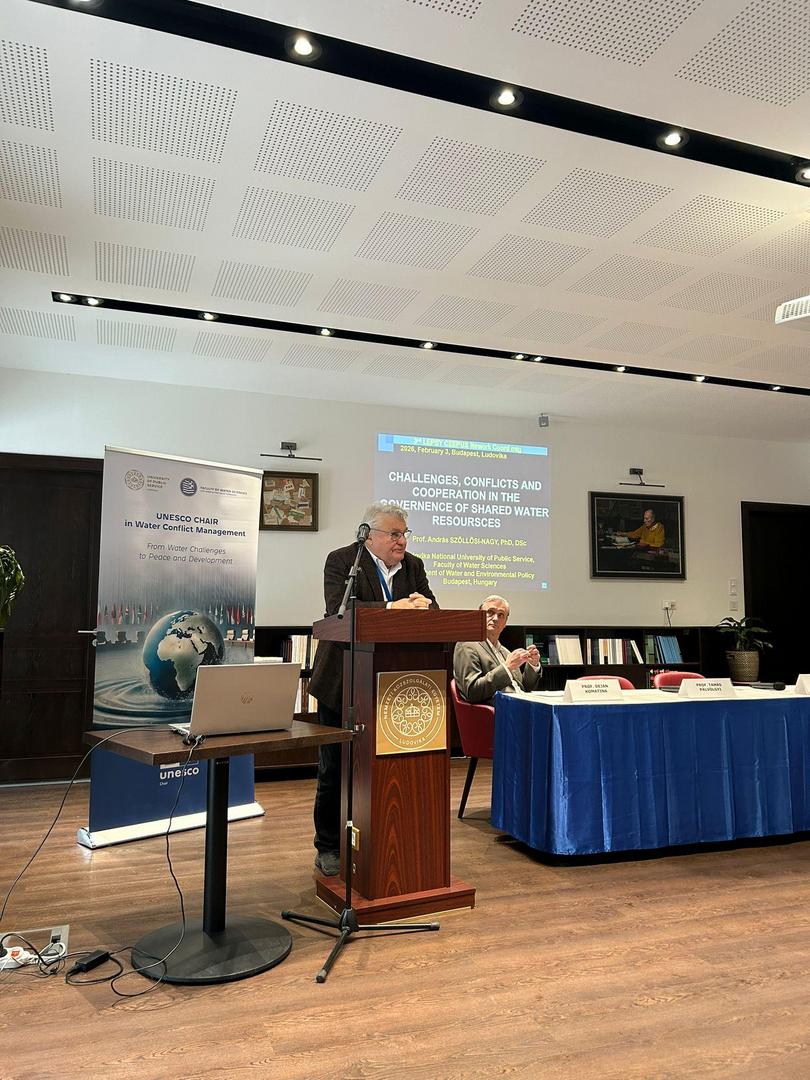 In the opening part of the programme, Professor András Szöllősi-Nagy delivered a comprehensive presentation on the challenges, conflicts, and cooperation opportunities in the governance of shared water resources. This was followed by a presentation by Dr. Dejan Komatina on the vision, mission, activities, and international partnerships of UCW, while Dr. Tamás Pálvölgyi outlined the key features of the International Water Governance and Water Diplomacy Master’s programme.